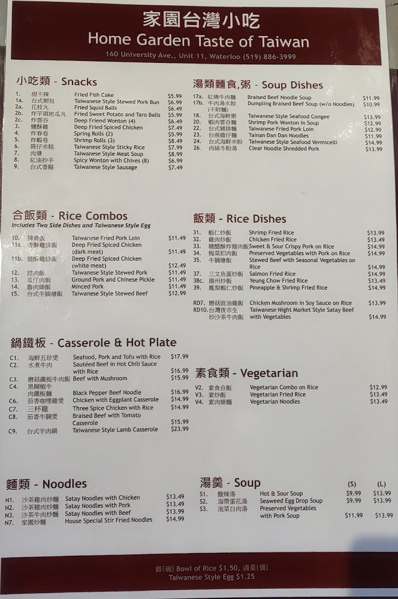 Introducing the menu at Home Garden Taste of Taiwan is a delightful journey into authentic Taiwanese cuisine, located at 160 University Ave W, Waterloo. The offerings showcase a range of comforting dishes that remind you of home-cooked meals.